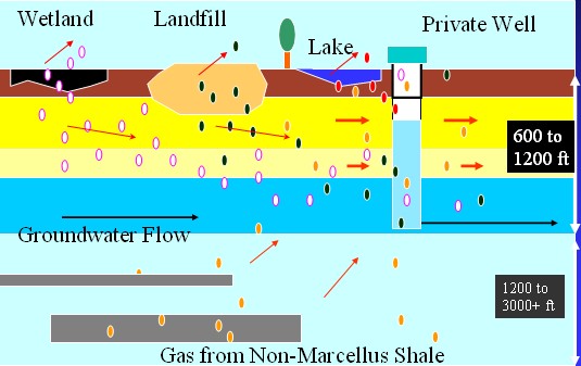Methane gas has been a “hidden” problem in Northeastern Pennsylvania. The gas is typically associated with wetlands, bogs, landfills, coal-producing formations, natural saline seeps, some glacial deposits, and gas storage areas. Because of the development of the Marcellus Shale, the presence of methane gas and the potential for methane gas migration is a growing concern. Methane is a colorless, odorless gas that is lighter than air. Natural gas is mostly methane (70 – 90 % CH4), carbon dioxide (0 to 8 % CO2), plus other gases. The other gases may include ethane (C2H6), propane (C3H8), butane (C4H10), and hydrogen sulfide (H2S) as well as small amounts of helium.